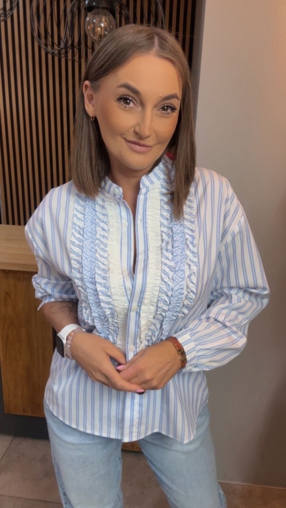 Elegancka koszula o klasycznym kroju z subtelnym, kobiecym akcentem. Model wyróżnia się dekoracyjną falbanką (żabotem) biegnącą wzdłuż zapięcia, która nadaje całości romantycznego i stylowego charakteru. Delikatny wzór w paski sprawia, że koszula prezentuje się lekko i ponadczasowo.
