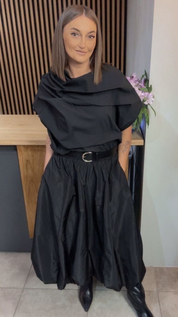 Dzięki elastycznej gumie w pasie oraz marszczonej konstrukcji spódnica idealnie dopasowuje się do sylwetki i zapewnia pełen komfort noszenia. Model posiada również delikatnie elastyczne wykończenie u dołu, tworzące charakterystyczny „palloncino” – efekt balonu. Wnętrze jest w całości podszyte, co zwiększa wygodę i nadaje całości eleganckie wykończenie.