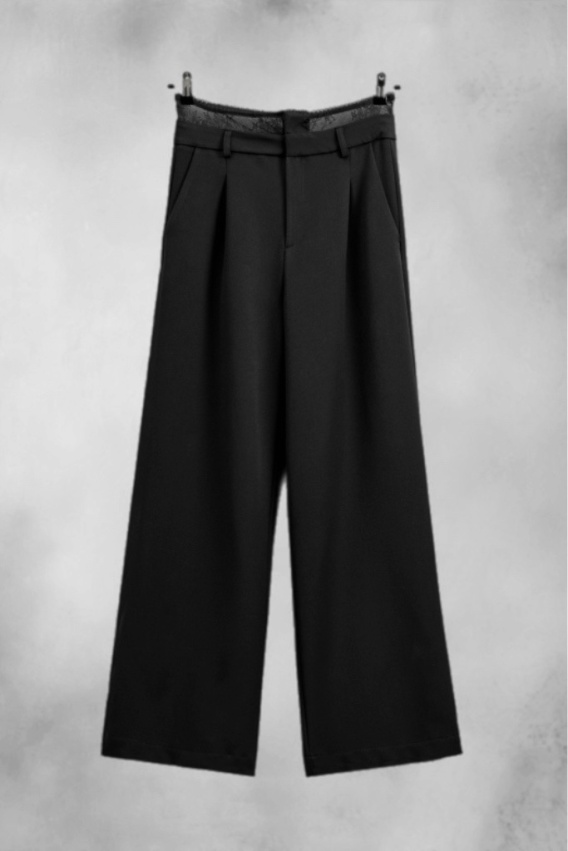 Eleganckie spodnie o szerokiej nogawce, wykonane z wysokiej jakości materiału, które łączą klasyczny krój z subtelnym, kobiecym akcentem. Model wyróżnia dekoracyjna koronka w pasie, nadająca całości wyjątkowego charakteru. Spodnie posiadają zaszewki oraz szlufki w talii, a także wygodne zapięcie na zamek i haftkę.