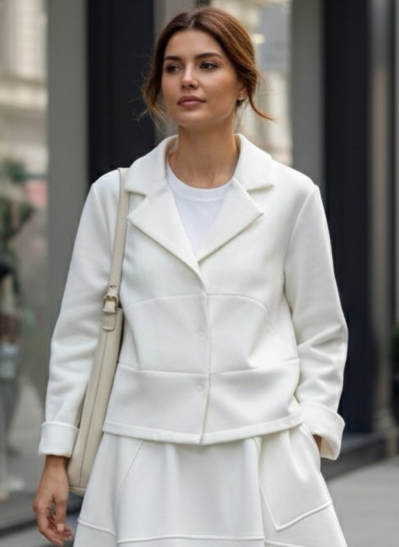 Model wyróżnia się luźnym, lekko pudełkowym krojem, który świetnie układa się na sylwetce i pasuje do wielu stylizacji - zarówno codziennych, jak i bardziej eleganckich. Szeroki kołnierz, ozdobne przeszycia oraz możliwość podwinięcia rękawów dodają mu modowego charakteru.