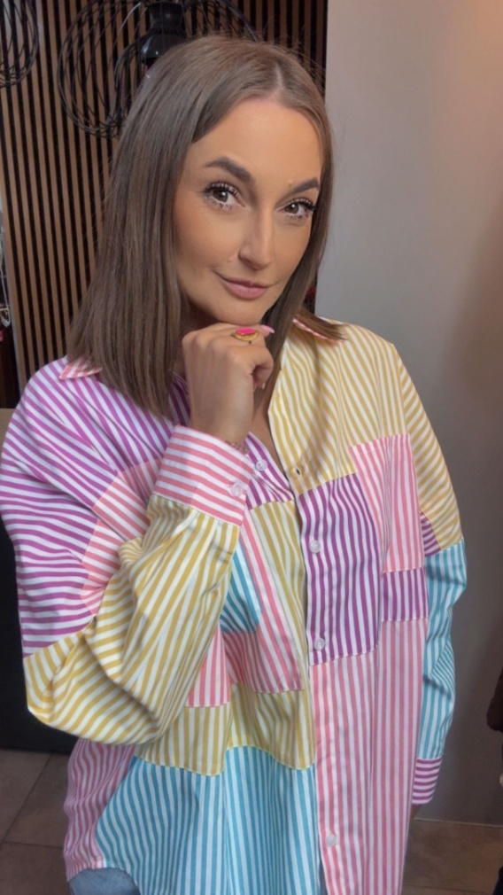 Efektowna koszula o luźnym, oversize’owym kroju, która przyciąga uwagę kolorowym patchworkiem w paski. Połączenie pastelowych odcieni zieleni, różu, błękitu i żółci nadaje jej świeżego, modnego charakteru i sprawia, że stylizacja nabiera lekkości oraz oryginalności.
