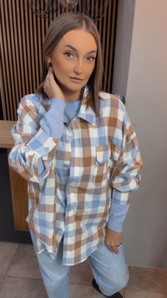 Koszula oversize w beżowo-błękitną kratę – 100% bawełna