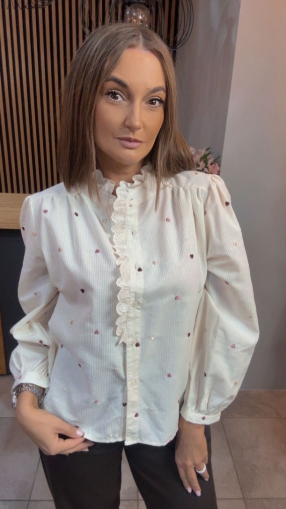 Model ma delikatny prążkowany wzór oraz drobne haftowane serduszka w odcieniach różu, beżu i burgundu, które dodają całości uroku. Kołnierzyk i listwa guzikowa wykończone koronką w stylu retro nadają koszuli wyjątkowej kobiecości. Bufiaste rękawy zakończone mankietami z guziczkiem podkreślają romantyczny charakter modelu.