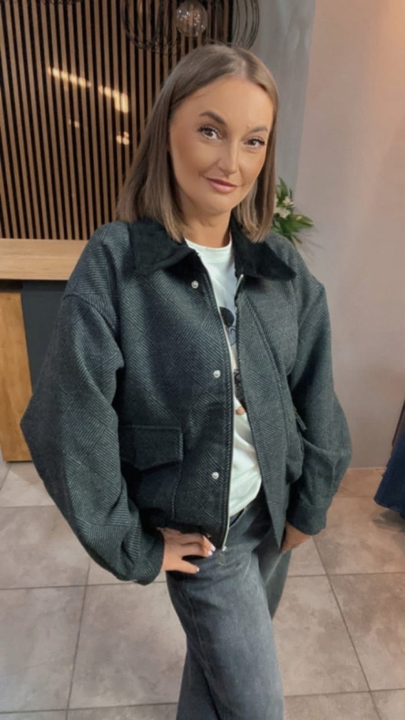Stylowa bomberka o luźnym, lekko oversize'owym kroju, idealna na chłodniejsze dni. Wykonana z przyjemnego w dotyku materiału o geometrycznym wzorze w kratkę, z kontrastowym kołnierzem z miękkiego sztruksu.