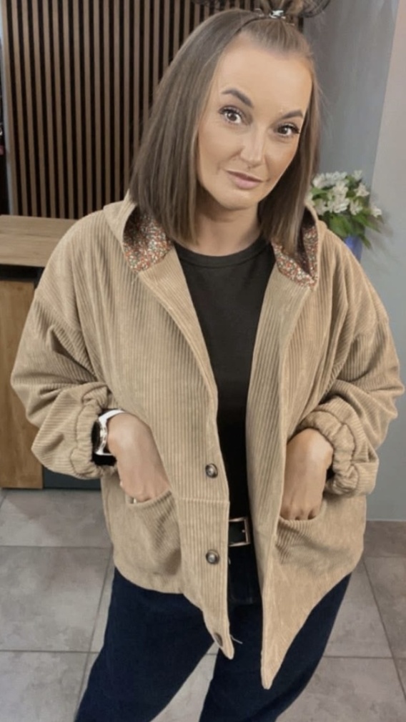 Stylowa kurtka damska wykonana z miękkiego sztruksu, idealna na chłodniejsze dni. Luźny, oversize'owy fason zapewnia wygodę i swobodę ruchów, a kaptur z kontrastową, wzorzystą podszewką dodaje całości wyjątkowego charakteru.