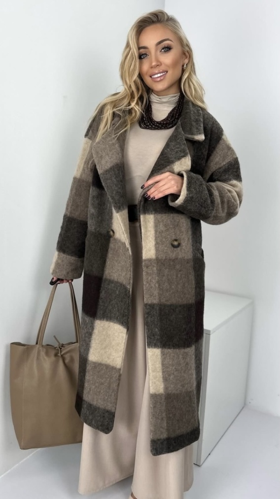 Stylowy, niezwykle elegancki płaszcz damski w ponadczasową, dużą kratę w odcieniach beżu, brązu i szarości. Wykonany we Włoszech z wysokiej jakości materiałów, które zapewniają komfort noszenia oraz trwałość na wiele sezonów.