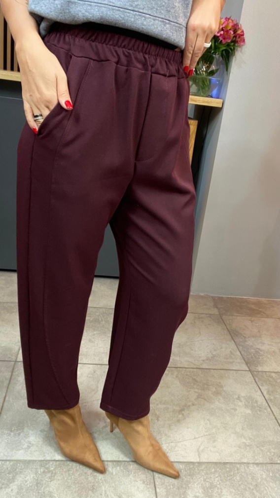 Wygodne i modne spodnie damskie o klasycznym kroju z lekko zwężaną nogawką. Model posiada gumkę w pasie, dzięki czemu świetnie dopasowuje się do sylwetki i zapewnia wygodę w każdej sytuacji. Po bokach znajdują się praktyczne kieszenie oraz ozdobne przeszycia, które optycznie wysmuklają nogi i dodają całości oryginalnego charakteru.