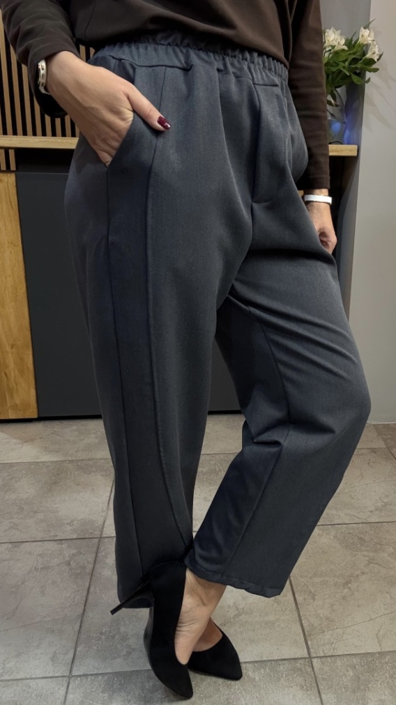 Wygodne i modne spodnie damskie o klasycznym kroju z lekko zwężaną nogawką. Model posiada gumkę w pasie, dzięki czemu świetnie dopasowuje się do sylwetki i zapewnia wygodę w każdej sytuacji. Po bokach znajdują się praktyczne kieszenie oraz ozdobne przeszycia, które optycznie wysmuklają nogi i dodają całości oryginalnego charakteru.