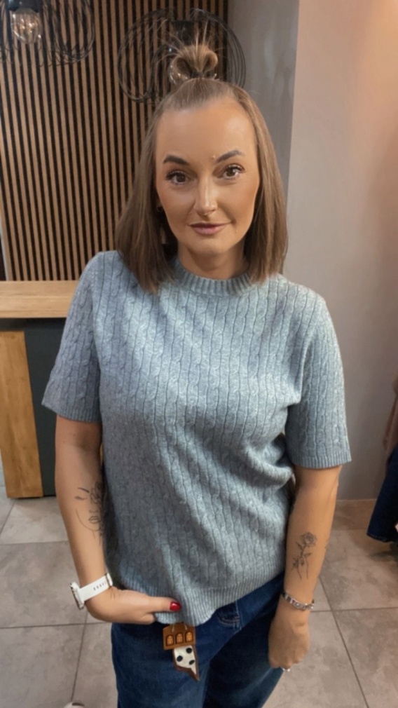 Stylowy i wygodny sweter damski o ponadczasowym kroju. Wykonany z miękkiej i elastycznej dzianiny, idealnie dopasowuje się do sylwetki, zapewniając komfort noszenia przez cały dzień. Subtelny splot warkoczowy nadaje mu eleganckiego charakteru, a krótkie rękawy sprawiają, że świetnie sprawdzi się zarówno w codziennych, jak i bardziej wyjściowych stylizacjach.